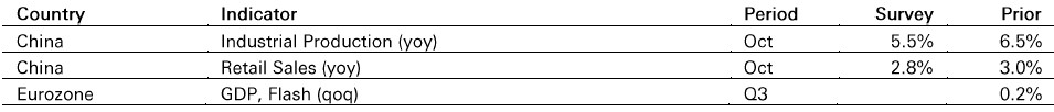 In China, growth in industrial production and retail sales likely moderated in October.