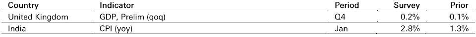 In the UK, a small rise in Q4 GDP is expected, reaching 0.2% qoq, with consumer spending remaining weak.