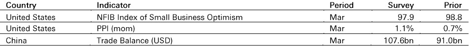 In the US, the NFIB Index of Small Business Optimism reading should begin to reflect worries about the Middle East conflict, with small firms likely to be hit harder by rising prices than large firms. PPI is likely to rise by 1.1% mom in March, from 0.7% mom in February, as recent outturns imply inflationary pressure was showing even before the oil price surge, and is likely to move higher from here.