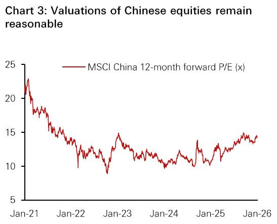 • Asia’s growth drivers remain robust, underpinned by resilient domestic demand and strong AI-related exposure, along with solid upstream industrial activity. Fiscal stimulus, supportive monetary measures and investment boosts outlined in China’s 15th Five-Year Plan provide a positive backdrop for the equity market. Hong Kong benefits from an improving property market outlook and strong capital inflows. Japan’s expansionary policy and solid earnings growth, South Korea’s rising memory-chip cycle, and Singapore’s safe-haven appeal add to Asia’s allure for investors.