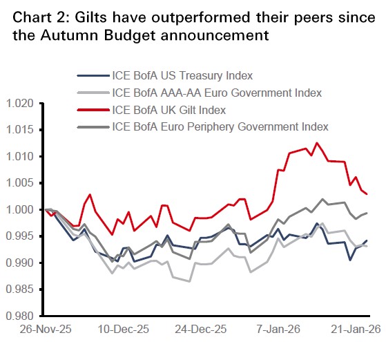• While we remain positive on global and US stocks and continue to position in Asia for geographical diversification, we have adjusted our equity allocation by upgrading Materials across regions and underweighting Europe ex-UK stocks after taking profits on European peripheral markets. UK Gilts have performed well since the Autumn Budget and benefit from favourable tailwinds, supporting our upgrade to overweight, and aligning with our investment grade credit positioning. We also upgrade Japanese government bonds to neutral following the recent sell-off.