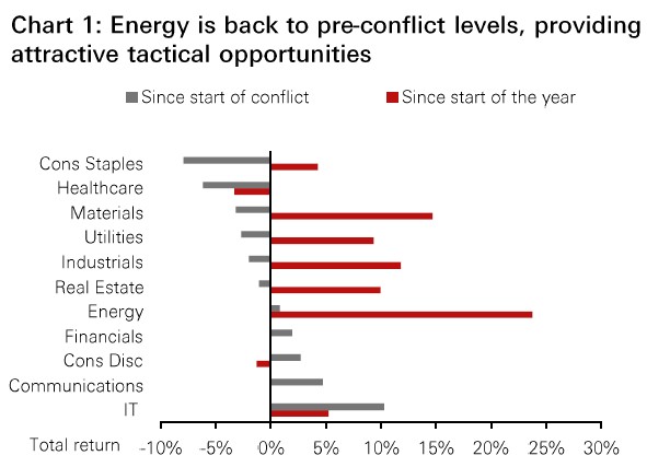 • Since early April, ceasefire negotiations have led to a rebound in risk appetite. As it will take time for the Strait of Hormuz and oil production to normalise, we believe energy prices are likely to remain elevated. We upgrade Energy to overweight across regions following its recent sell-off, to navigate oil price volatility and generate strong cash flows, while continuing to build resilient portfolios with quality bonds, gold and multi-asset diversification.