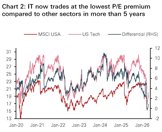 • Recent headlines around the US Q1 earnings season affirm the continuation of the tech capex cycle. As previous concerns over excessive investment and AI disrupting software companies have eased, and Technology continues to be supported by improving earnings expectations and reduced valuations, we have further increased our exposure to global and US technology and upgrade European IT to overweight due to stronger earnings visibility.