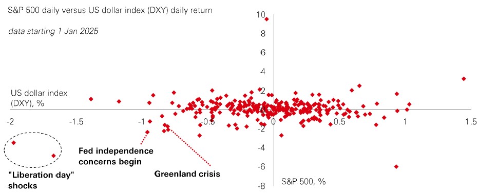 Amid last week’s geopolitical turmoil, we have seen echoes of last April’s “Liberation Day” market action: US stocks declining in lockstep with US Treasuries and the US dollar. This is important. It provides further evidence that traditional portfolio diversifiers may struggle to perform as expected, particularly when US policy decisions – whether it be around trade, the Fed, or foreign relations – are driving investor caution.