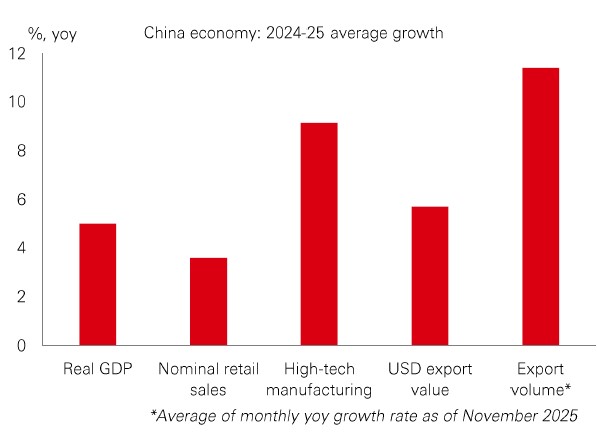 Chinese stocks have got off to a solid start in 2026 – buoyed by a fresh wave of homegrown tech advances, from a new AI model and robotics to commercial rockets and flying cars. As part of China’s new five-year plan, technological innovation (especially in AI) remains a key priority. But after last year’s market re-rating, investors will want stronger fundamentals and profits this year. Key to this will be the macro backdrop. Strong exports and industrial production helped China meet its real GDP growth target of 5% in 2025. But weak domestic demand, with the property market extending its decline, means more work is needed to rebalance towards a more consumption and services driven economy. Policymakers have prioritised expanding domestic demand by boosting consumption and stabilising investment this year. Fiscal policy is set to remain proactive, and monetary policy moderately loose. |