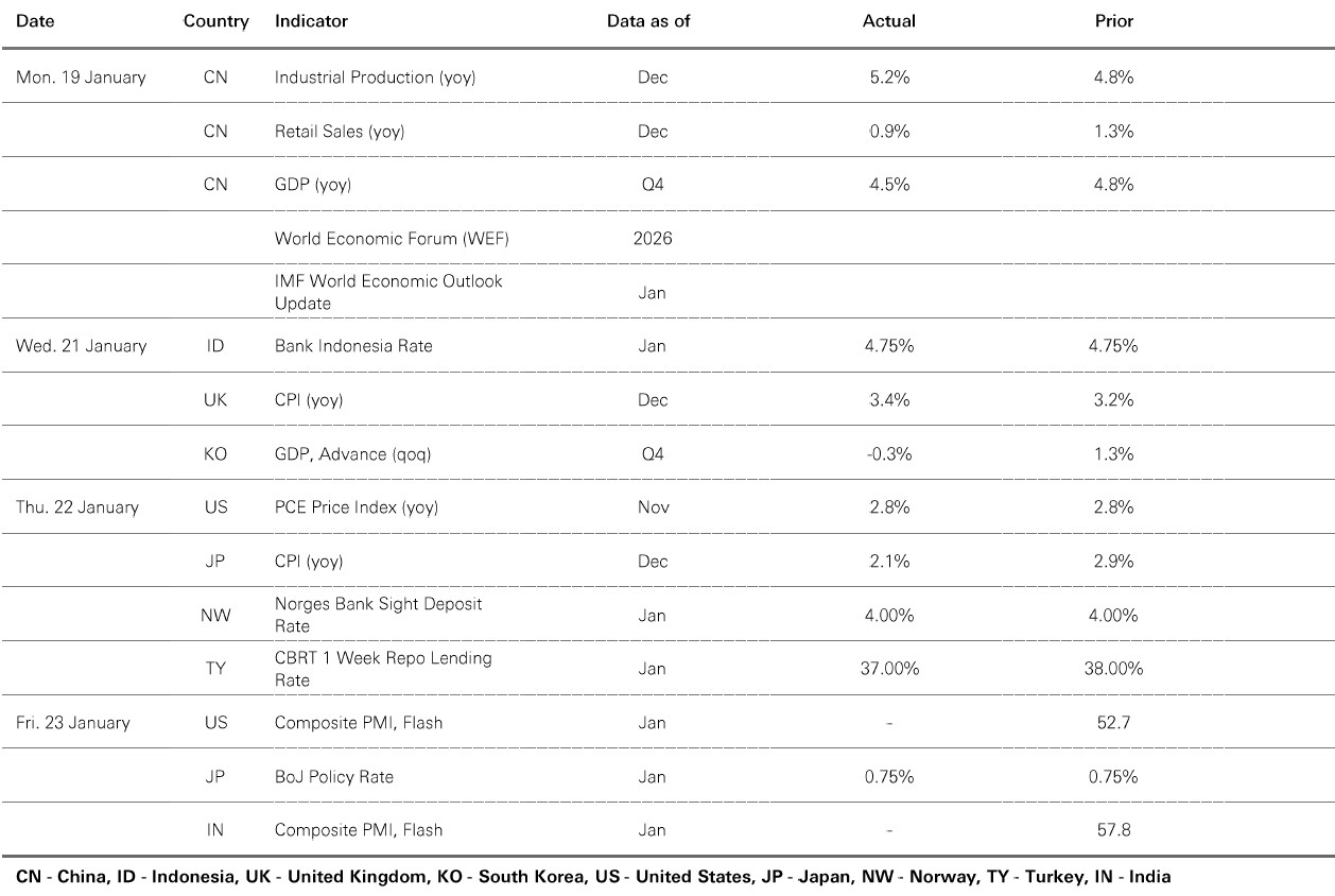 Heightened geopolitical concerns injected volatility into financial markets last week. Gold prices surged, while the US dollar retreated against a basket of major currencies. In Japan, rising fiscal unease weighed on long-dated yields, steepening the yield curve ahead of February’s general election. Long-end sovereign yields in Europe broadly climbed, and 10-year US Treasury yields rose modestly in the run-up to next week’s rate decision by the Federal Reserve. In the US stock market, the small-cap Russell 2000 index maintained its recent outperformance, whereas tech sector stocks lagged. Elsewhere, the Euro Stoxx 50 was on course to close the week lower, with Nikkei 225 edging down amid elevated volatility in JGB yields. Emerging market stocks advanced, with LatAm leading the rallies. EM Asian indices traded mixed: Kospi hit a record high, but Sensex declined.
