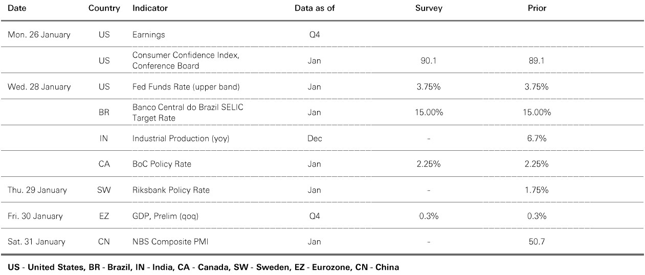 The value of investments and any income from them can go down as well as up and investors may not get back the amount originally invested. Past performance does not predict future returns. The level of yield is not guaranteed and may rise or fall in the future. For informational purposes only and should not be construed as a recommendation to invest in the specific country, product, strategy, sector, or security. Diversification does not ensure a profit or protect against loss. Any views expressed were held at the time of preparation and are subject to change without notice. Any forecast, projection or target where provided is indicative only and is not guaranteed in any way. Source: HSBC Asset Management, Bloomberg, Macrobond. Data as at 7.30am UK time 23 January 2026.