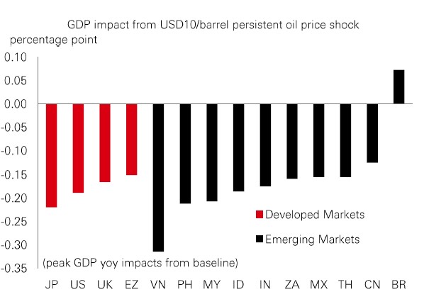 In terms of oil price shocks, the size, speed, and persistence of the price move will determine the implications for the growth-inflation mix, profits, and investor sentiment. But they also impact countries differently. So, what could a persistent USD10 shock do? Modelling shows that the growth and inflation impact on developed economies would be largely uniform. But in emerging markets, it’s more variable. Growth in Asian oil importers, particularly ASEAN and South Korea, would be more vulnerable to disruption. And inflation in India and Thailand could see more upward pressure than most. |