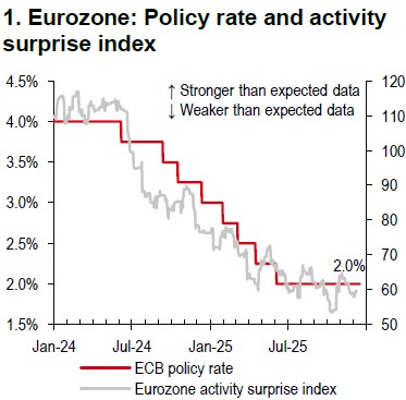 The European Central Bank (ECB) held its key deposit rate at 2% on 18 December, in line with market expectations (Chart 1). The ECB’s updated forecasts were hawkish, with growth projections raised to 1.2% for 2026 and 1.4% for 2027 (from its September forecasts of 1.0% and 1.3%, respectively) and only limited inflation undershooting for the next two years expected. This makes further rate cuts unlikely. However, ECB President Christine Lagarde did not support expectations of a rate hike as early as next year, emphasising that all options remain open. Our economists expect the ECB to maintain its current policy stance through 2026, with a possible rate increase in 2027. Given this policy stability, developments in other major economies are likely to have a greater influence on the EUR’s direction. The EUR may also face headwinds if regional fiscal measures fall short of expectations or if external conditions become less supportive.