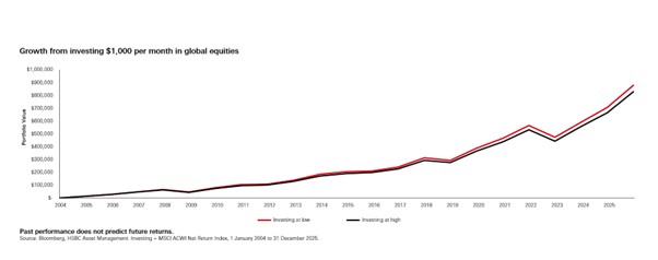 Source: Bloomberg, HSBC Asset Management, Investing = MSCI ACWI Net Return Index, 1 January 2004 to 31 December 2025. Past performance is no guarantee of future returns