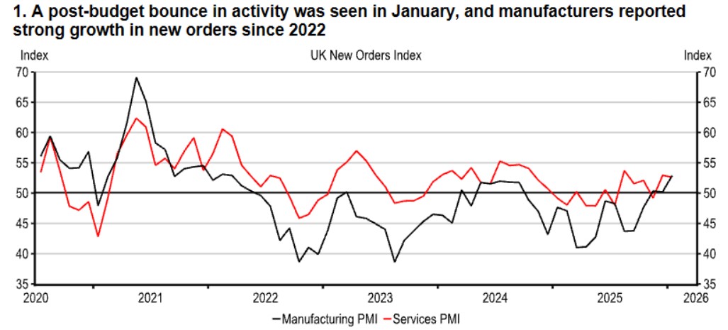The year has started with mixed and volatile data, so it’s unclear how much underlying momentum in the economy has improved. Measures of business activity reported a sharp rebound in activity in January, most notably across services firms. However, consumer confidence ticked only 1pt higher, as improved confidence in personal finances was offset by lower expectations of the economy for this year. Those dynamics left consumers to continue to prefer saving. Elsewhere, there were signs that demand conditions are, at least, stabilising, house prices rose 0.3% m-o-m and manufacturers reported the fastest pace of new order growth since May 2022.
