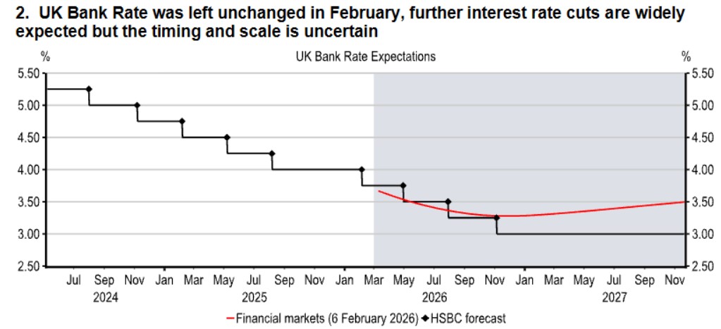 At its latest policy meeting the Bank of England’s (BoE) Monetary Policy Committee left Bank Rate unchanged at 3.75%. Four of the nine-strong Committee voted for a cut, while more broadly, policymakers appear to be gaining confidence in the disinflationary process. The prospect of lower inflation reflects weak demand in the economy, a higher rate of unemployment, and policy measures announced at the Autumn Budget. Governor Andrew Bailey, who voted for unchanged rates this month, will be key in determining the timing of the next cut, given his relatively middle ground stance. Mr Bailey suggested that he needed to see a further falls in inflation expectations alongside the expected moderation in the current inflation rate. That would help to further alleviate concerns of upside risks to inflation over the medium term. It is widely expected that the CPI inflation rate will fall to around 2% in April 2026.