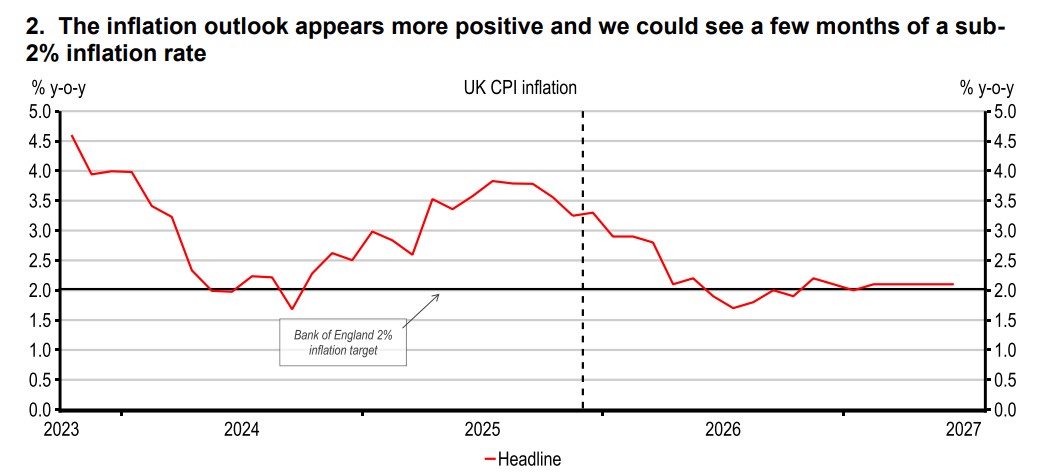 We remain relatively optimistic that Q1 2026 will prove better than the prior quarter. Indeed, there was some positivity that could provide a sound platform: the UK inflation rate fell to 3.2% and the Chancellor’s Budget announcements should help see some sub-2% inflation rates in the middle of 2026. That improved inflation outlook coupled with the soft backdrop described above, helped see UK Bank Rate being cut to 3.75% at the Bank of England’s (BoE) December policy meeting. In our view, interest rates will gradually fall further in 2026, which should enable a pickup in consumer spending and some more investment.